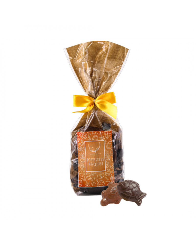 Surtido de chocolate negro y con leche en forma de fritura, decorado con conejo verde